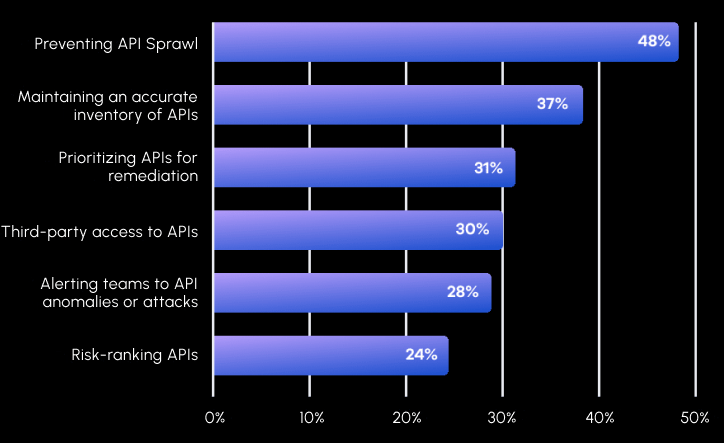 Securing APIs presents a dynamic set of challenges for organizations. Topping the list, as reported by 48% of respondents, is preventing API sprawl, reflecting the rapid proliferation of APIs in the modern enterprise. The second most pressing challenge, identified by 39%, is maintaining an accurate inventory of APIs, followed by managing third-party access to APIs, at 30%.