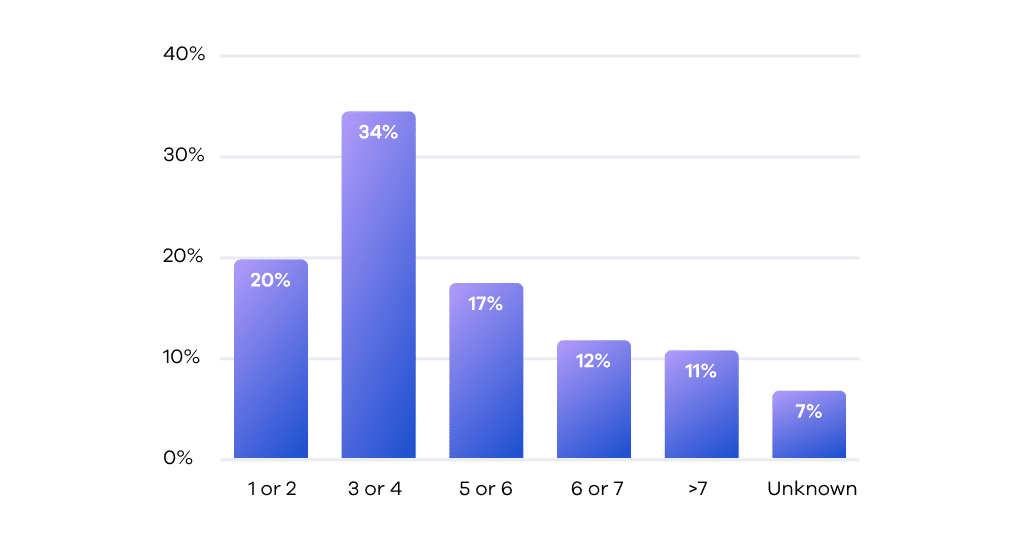 60% reported a data breach in the past two years. Of these, 74% had at least 3 API-related breaches. Alarmingly, 40% had five or more, and 11% faced over seven, stressing the dire need for enhanced API security.