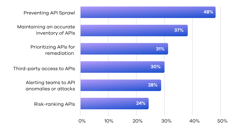 Securing APIs presents a dynamic set of challenges for organizations. Topping the list, as reported by 48% of respondents, is preventing API sprawl, reflecting the rapid proliferation of APIs in the modern enterprise. The second most pressing challenge, identified by 39%, is maintaining an accurate inventory of APIs, followed by managing third-party access to APIs, at 30%.