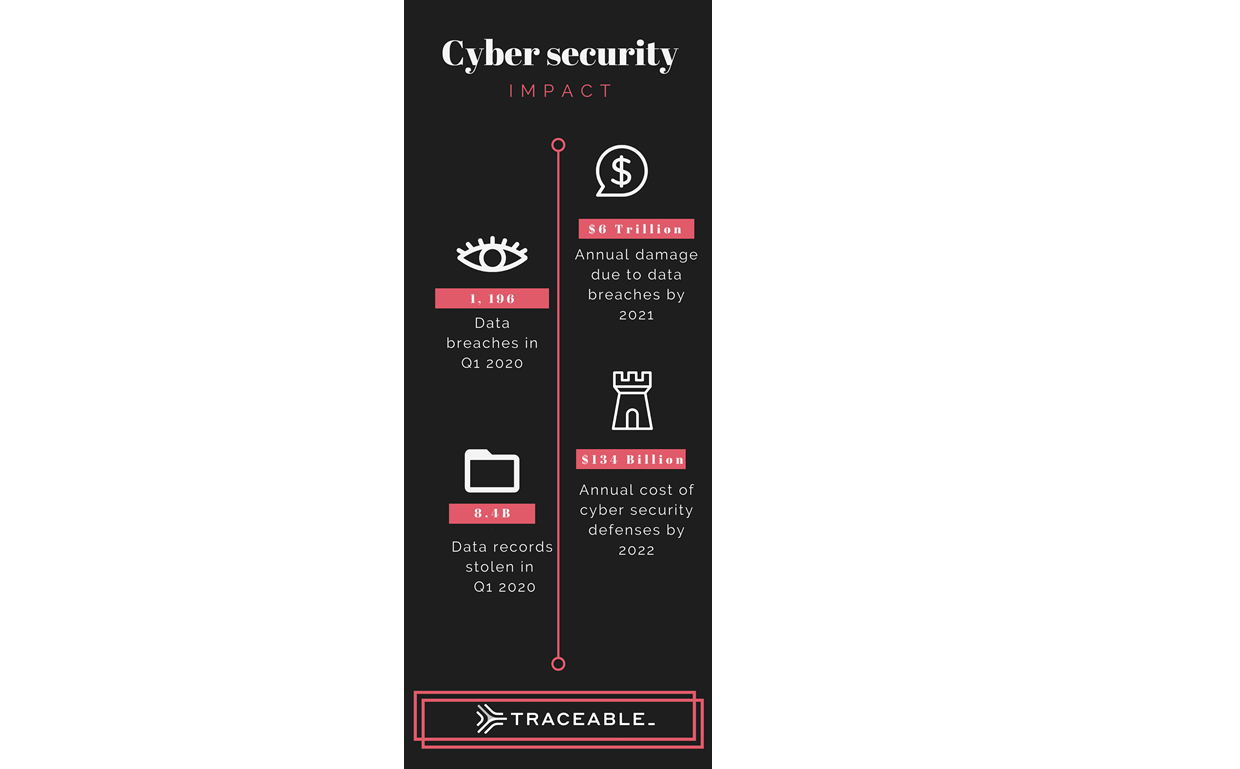 In just the first quarter of 2020, there have already been 1,196 reported data breaches, resulting in a theft of 8.4 Billion data records. The total worldwide cost of cybercrime is forecast to hit $6 Trillion per year by 2021, and the global expense in defending against these attacks is projected to reach $134 Billion per year by 2022.