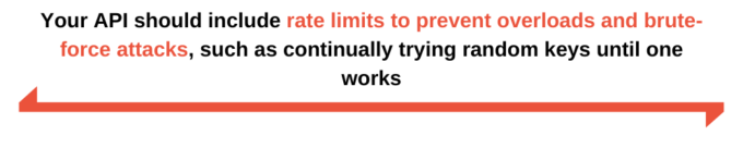 Another one is API4:2019 Lack of Resources & Rate Limiting. Your API should include rate limits to prevent overloads and brute-force attacks, such as continually trying random keys until one works. That's one of the things you can examine as part of performance testing. If you have documented rate limits, go beyond them to ensure that all endpoints reject additional requests with an appropriate error response.