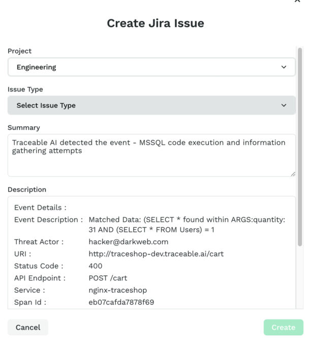 - Security events: A Jira ticket can be created based on a security event that has taken place. This can include threat actors, specific URI, service/endpoints, and more.