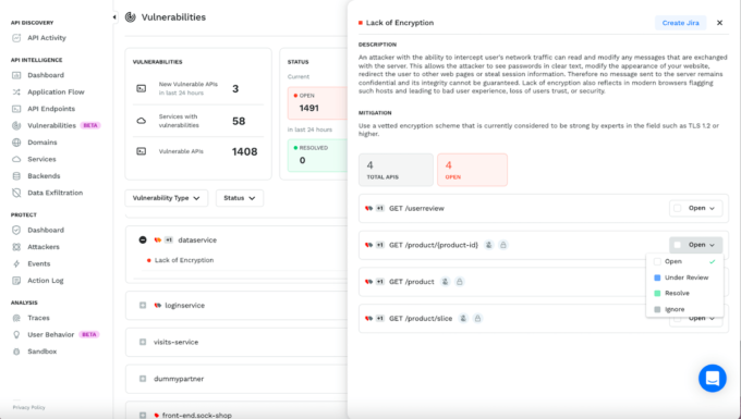 - Vulnerabilities Detection: A Jira ticket can be based on a specific vulnerability that has been identified: This can include vulnerability type, the total number of APIs impacted, mitigations details.