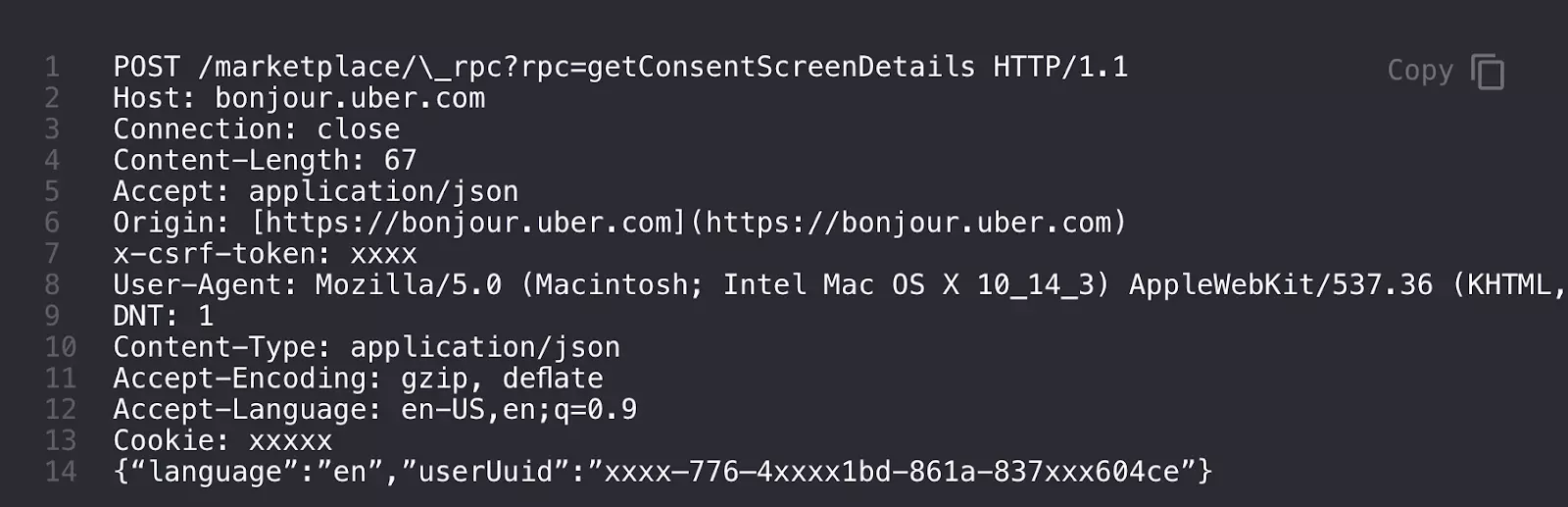 When a new Uber driver joins the platform through a referral link, their browser communicates with the API host “bonjour.uber.com”. The registration process triggers an API call to the API endpoint of: