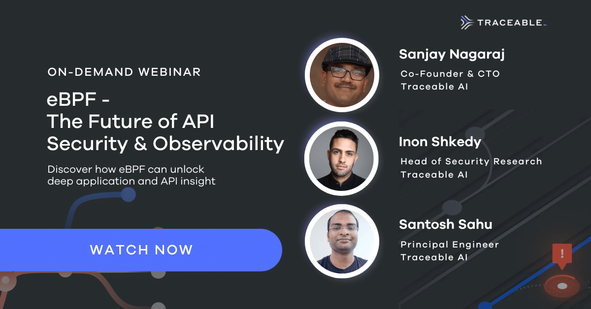 Security through observability has become a cornerstone for security teams, and we at Traceable are proud to be the first API Security vendor to provide an eBPF solution. Watch this webinar to learn how observability through extended Berkeley Packet Filter (eBPF) provides greater API security while unlocking deep application and API insights. Traceable’s Co-Founder and CTO, Sanjay Nagaraj, covers what eBPF is and how it works for observability, what it means for API security, and how Traceable uses eBPF to catalog and protect your APIs.Bottom line, we’re always hosting new webinars in order to provide you with the insights and information you need to be in control of your APIs. Join us!