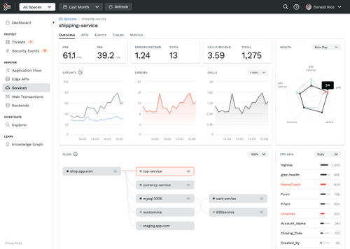 Real-time topology map shows API flows and interconnectivity between services (endpoints, internal, and 3rd party).