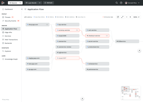 Real-time topology map shows API flows and interconnectivity between services (endpoints, internal, and 3rd party).